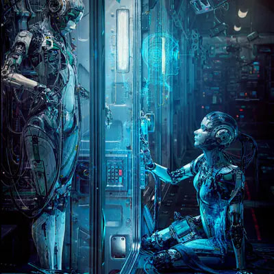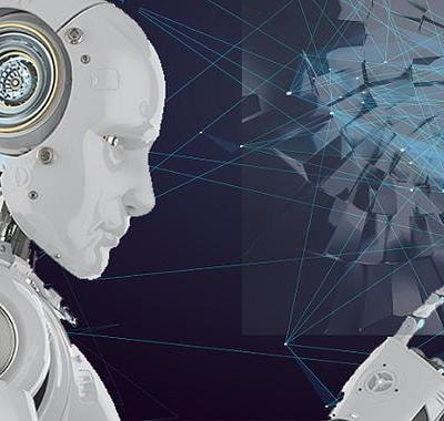 救援机器人在地震灾区,用铲斗清理废墟开辟救援通道。